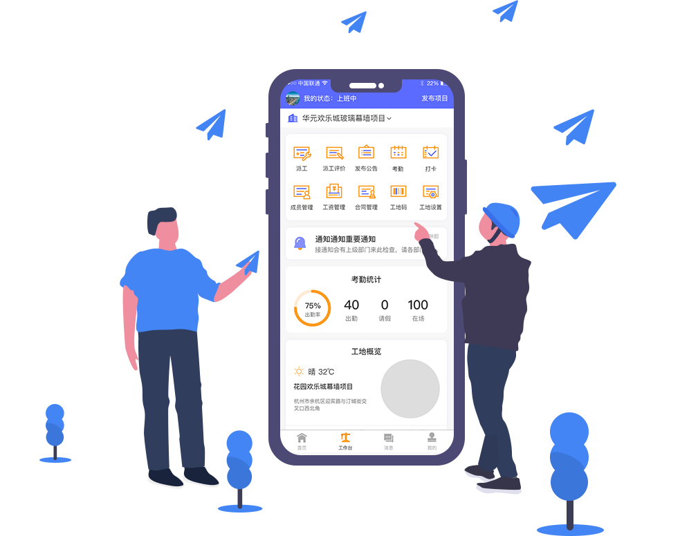 工地通App充分考虑交互体验,使得操作简单便捷,上手容易;工地派工更灵活、进出场管理、人员基本信息、考勤管理、工资管理、地理围栏、发布招工信息、智能化工作推荐到工人。